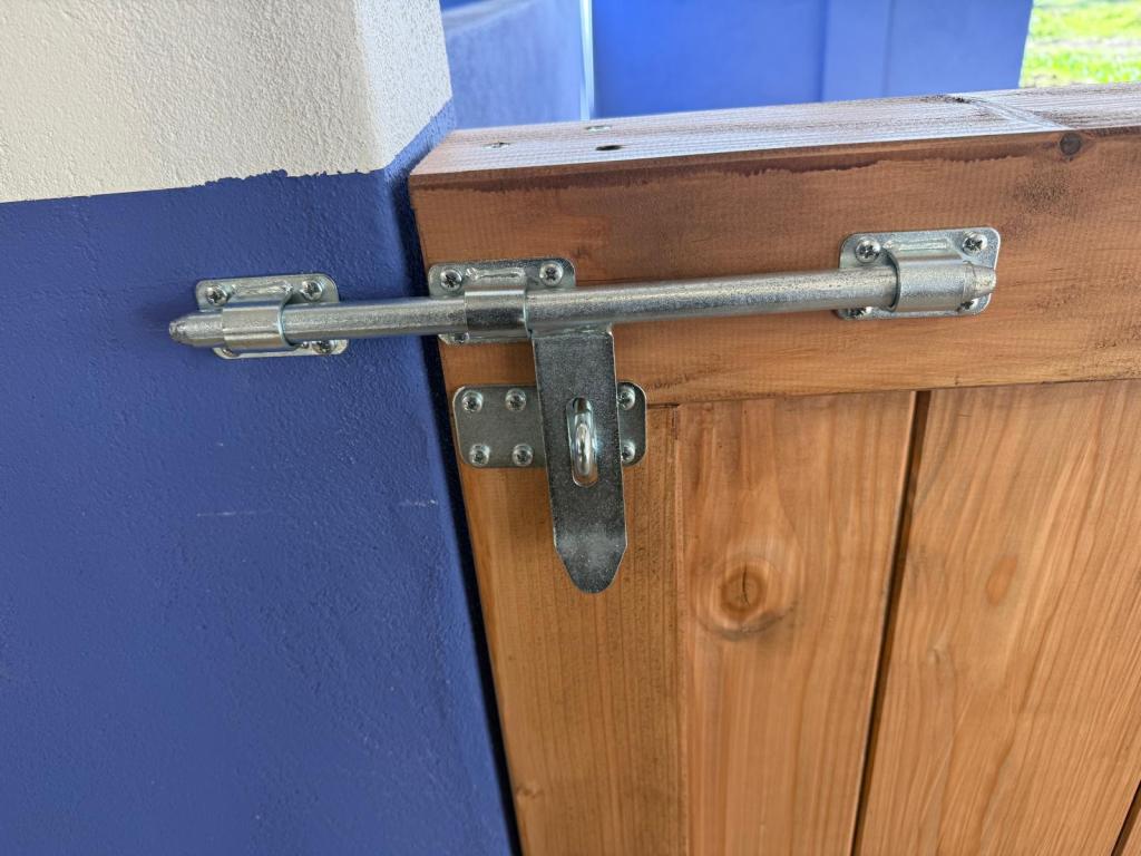 - Het monteren van het sluitmechanisme op de deur en de wand: om de deur ook dicht te kunnen houden moet er een zwaar sluitmechanisme geplaatst worden. De volgende stappen ondernemen we hiervoor: