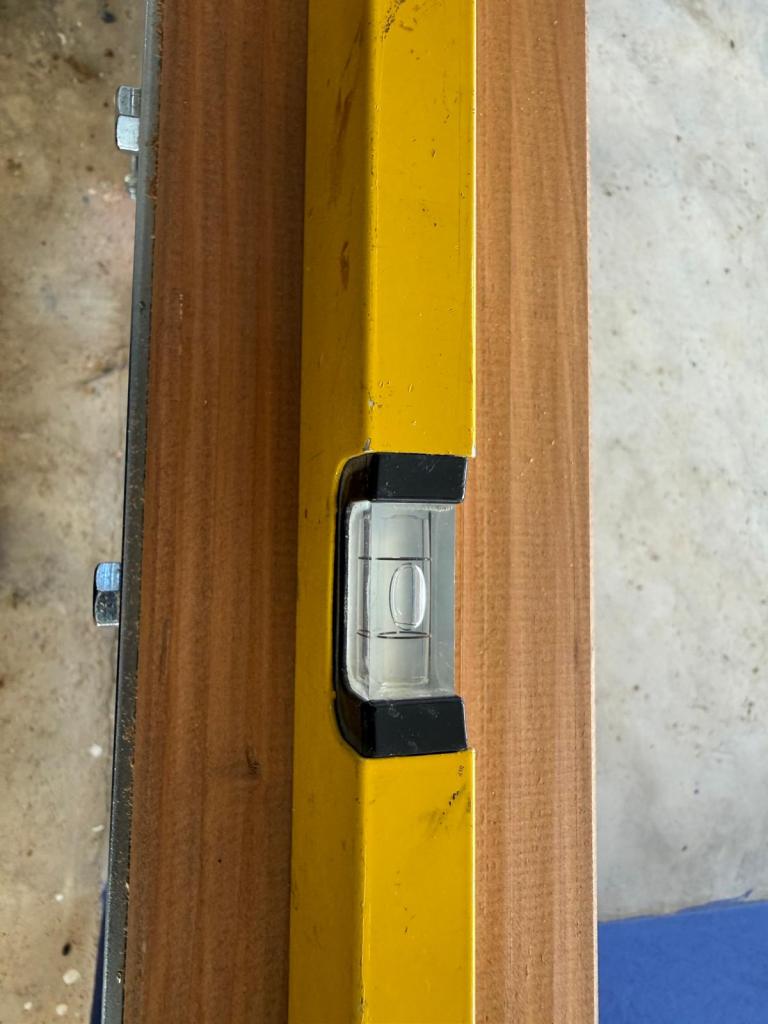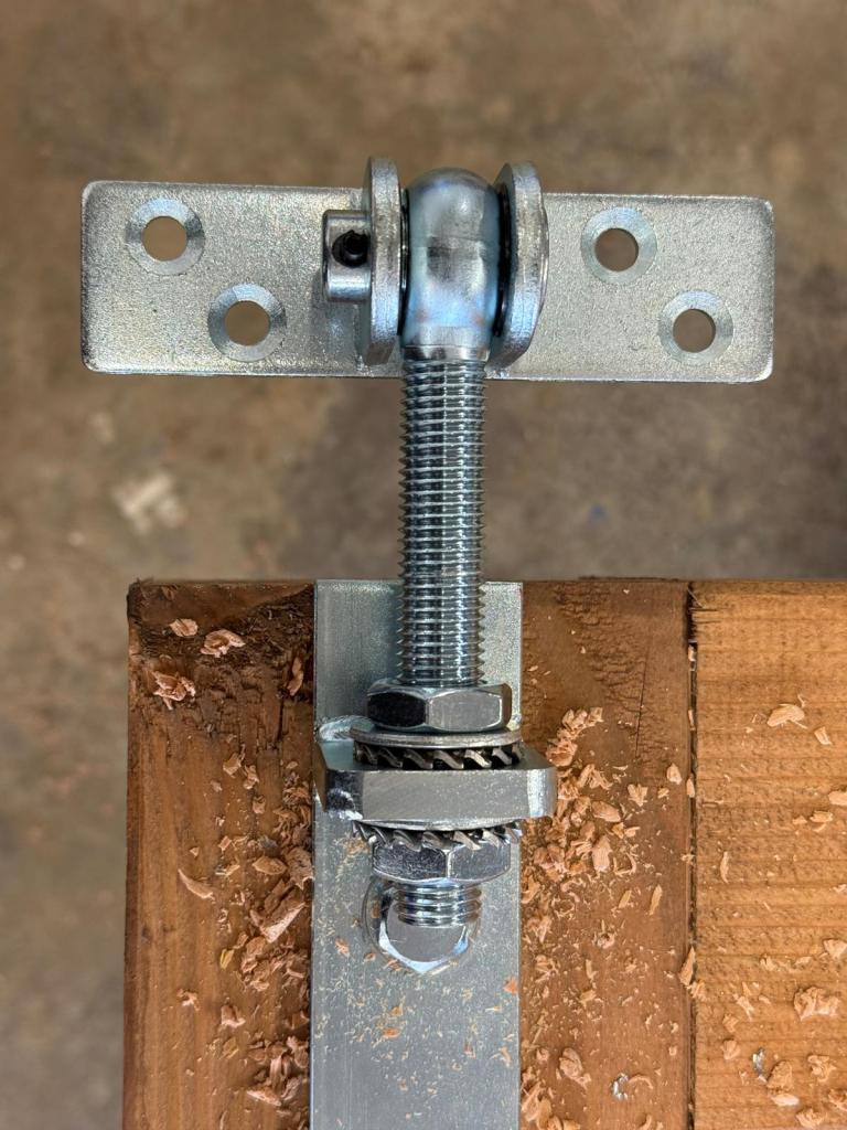 - We zorgen er voor dat de heng zo ver mogelijk aan het uiteinde van het ophangmechanisme bevestigd wordt maar wel zodanig dat we nog ruimte hebben om de deur uiteindelijk waterpas te hangen