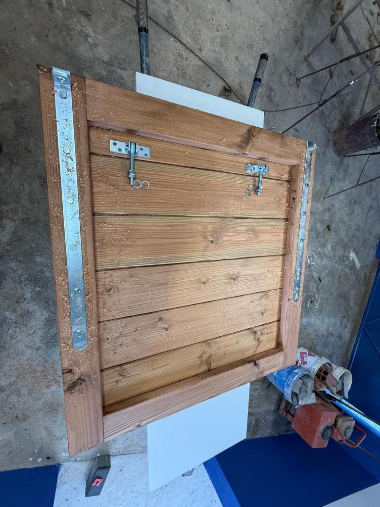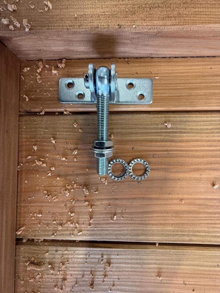 - We monteren het sluitoog door voor te boren met een 4mm houtboor en schroeven deze vervolgens vast met 6 schroeven van 50mm lengte en 5mm doorsnede.