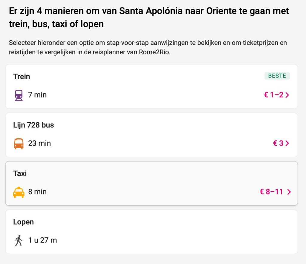 4 manieren dus waarbij de laatste afvalt. Het is immers 18:00 uur en de trein vertrekt over een uur vanaf Lisboa Oriente. Daar naartoe wandelen kost ca. 1,5 uur. De 3 andere opties zijn allemaal haalbaar. Maar wat doet een Gen-Z-er? Die pakt de metro terug (zien jullie die in de opties staan?) en wat blijkt: die nemen ze ook nog eens de verkeerde kant op… Toen ze daar achter kwamen zijn ze uitgestapt en dan alsnog maar de taxi genomen. Echter, het is spits in Lissabon en het is even billen knijpen of ze et op tijd gaan redden.