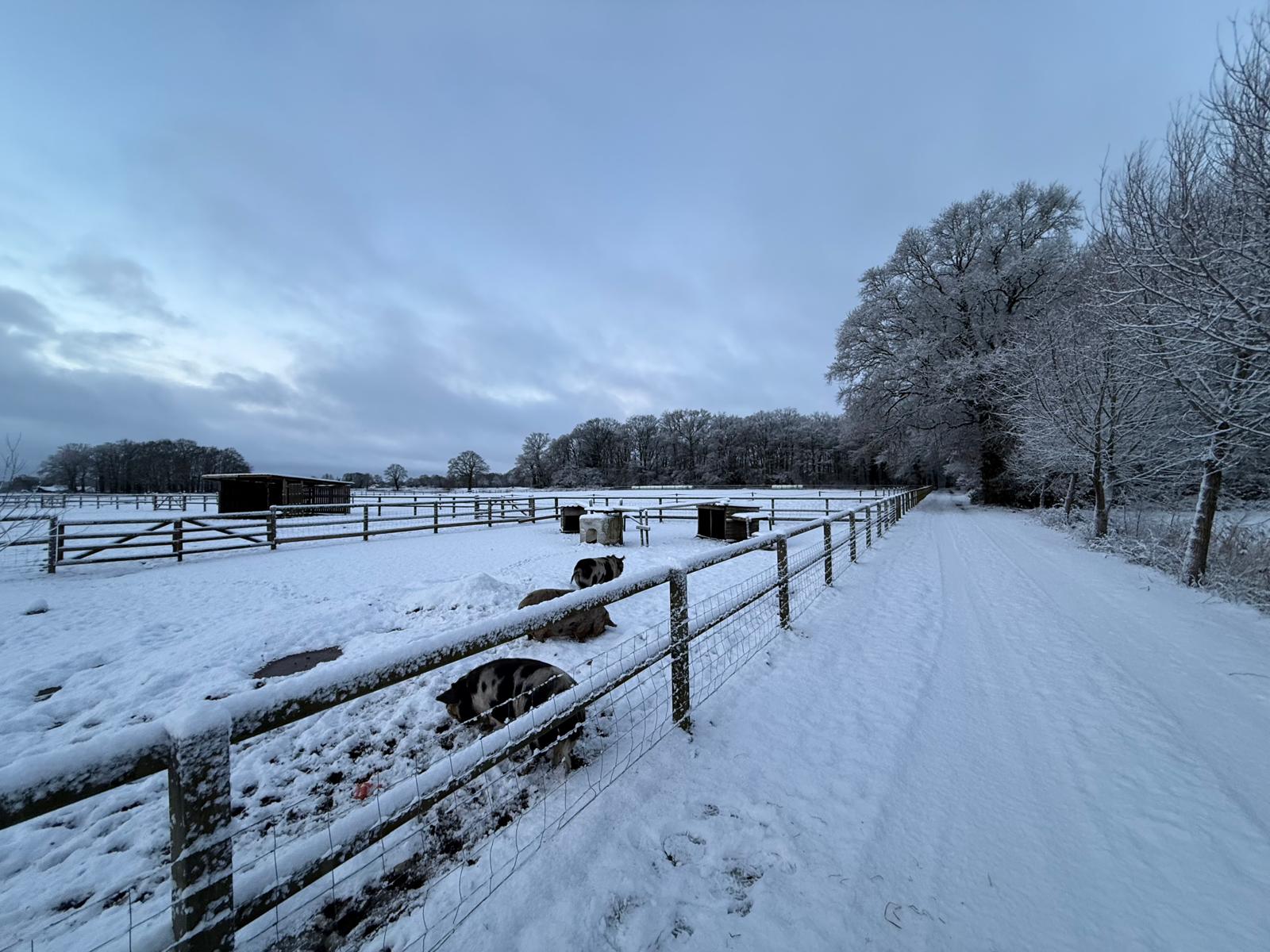 Tot slot is door de sneeuwlaag de paardenmest in de paddocks niet meer te zien: dit zullen we dan ook pas op kunnen ruimen als de sneeuw weer weg is. Dat zal nog wel even op zich laten wachten want er ligt een behoorlijk pak en er is volgens de weerberichten nog meer op komst…