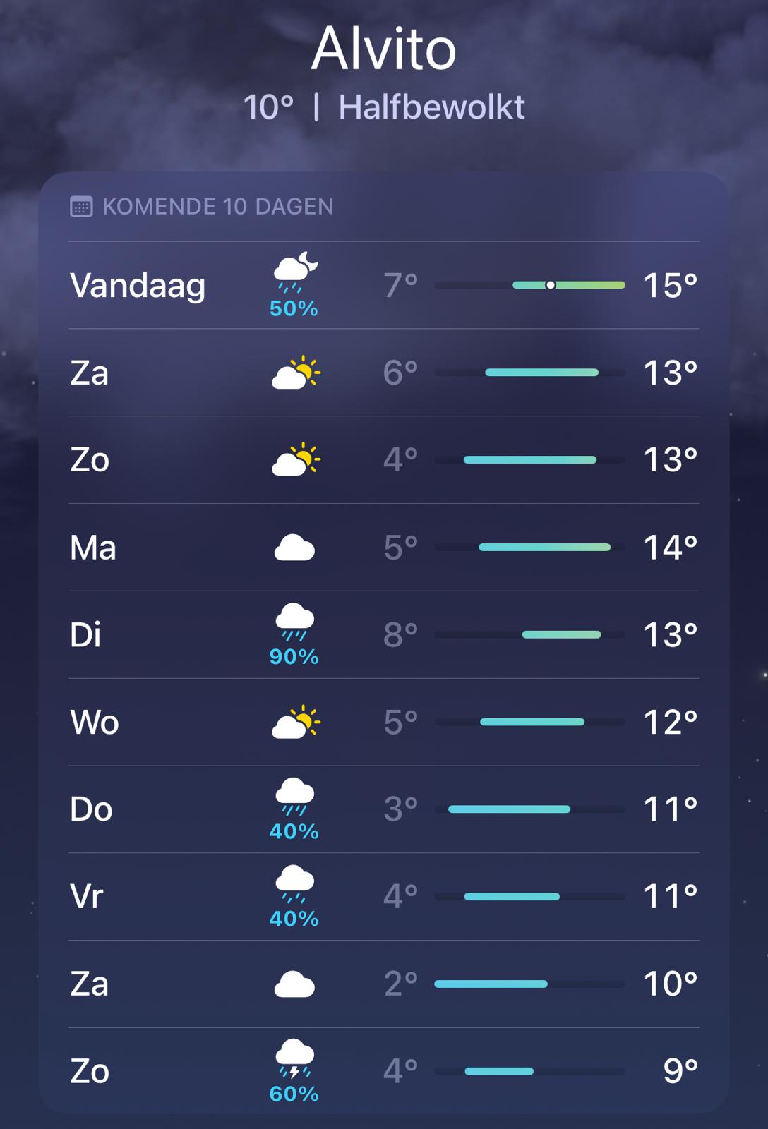 De dag- en nachttemperaturen zijn aan het begin van de komende week in Alvito tussen 7 en 14 graden warmer dan hier in Nederland. Eind van de komende week zijn de nachttemperaturen nagenoeg gelijk en liggen de dagtemperaturen een graad of 5 hoger. In Nederland een aantal dagen sneeuw, maar het aantal dagen met kans op neerslag is nagenoeg gelijk. In Portugal laat de zon zich een aantal dagen zien, in Nederland niet…