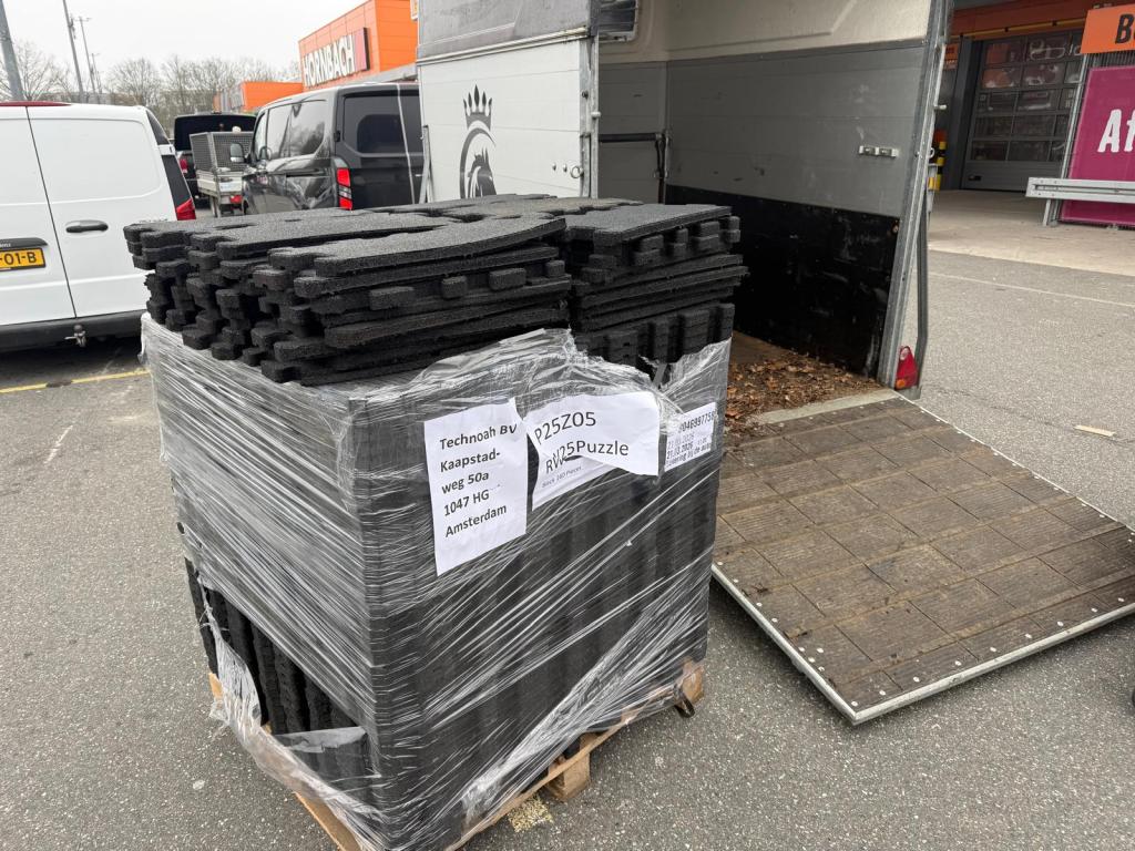 Bij de Hornbach was er weer voldoende voorraad van de rubberen tegels van 2,5 cm dikte. Dus alles vooraf besteld en klaar laten zetten