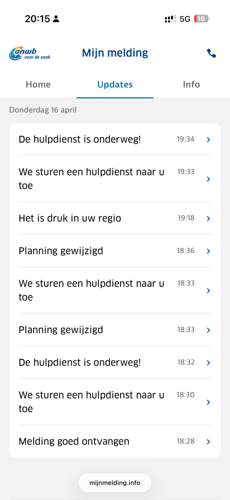 Na het melden van de storing bij de ANWB wordt je eerst nog teruggebeld: ze wilden ook de informatie van de trailer hebben en welke reis ik ging maken omdat ik had aangegeven naar Portugal af te reizen. Ze willen voorkomen dat je onderweg wederom stil komt te staan.