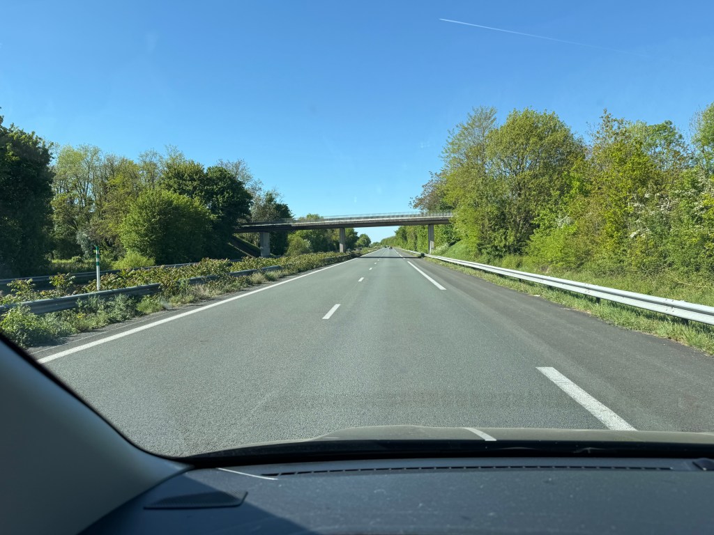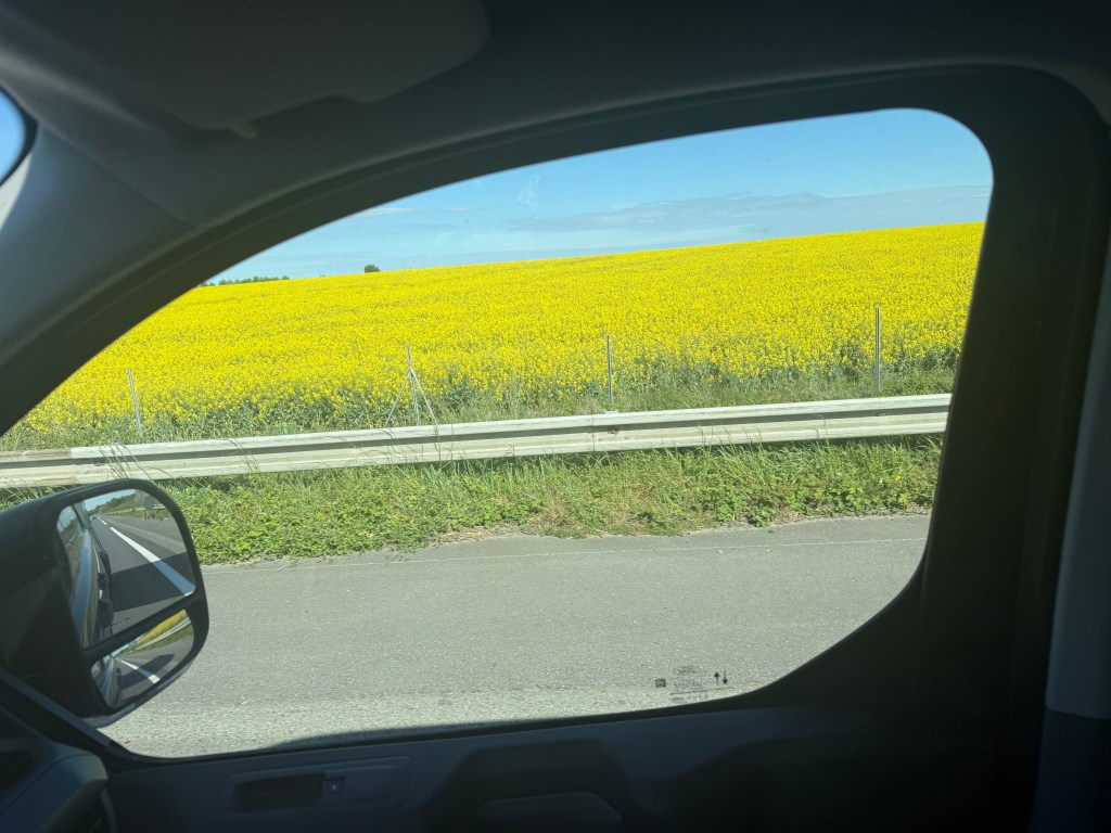 Als de rit eenmaal voorbij Tours is wordt het later op de ochtend en gaat de temperatuur omhoog en trekt de lucht open. Je ziet ook duidelijk dat de natuur hier al verder in het voorjaar zit dan bij ons in Nederland: de bomen zijn allemaal groen en het gras staat al hoog. De velden vol met koolzaad geven het plaatje wat meer kleur en in combinatie met de blauwe lucht is het helemaal voorjaar! Eenmaal bij Bordeaux gaat de temperatuur naar de 20 graden en toen we voorbij de Pyreneeën waren in Spanje tiksen we ver in de middag rond 5 uur bij Burgos de 30 graden aan. Bom Homem!