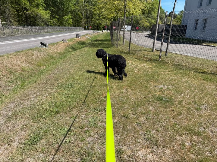 Voor onze Briard Evy is het natuurlijk ook een lange rit, maar regelmatig stoppen we even om haar even uit de cabine te halen en even te snuffelen. Het is weer even wennen voor ze.