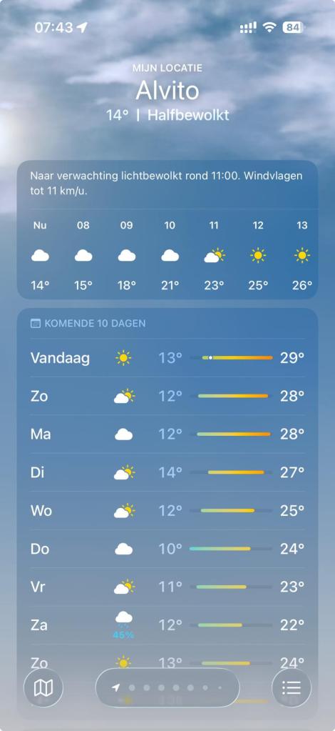 De rest van de week laat zonnig weer zien waarbij de temperatuur steeds per dag een graadje minder wordt. Maar, niets is zo veranderlijk als het weer, dus we gaan zien hoe het iedere dag gaat verlopen: de vooruitzichten zijn in ieder geval mooi! Bom Homem!