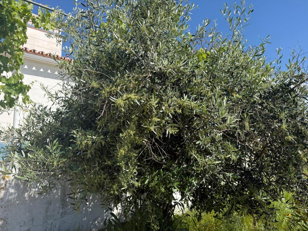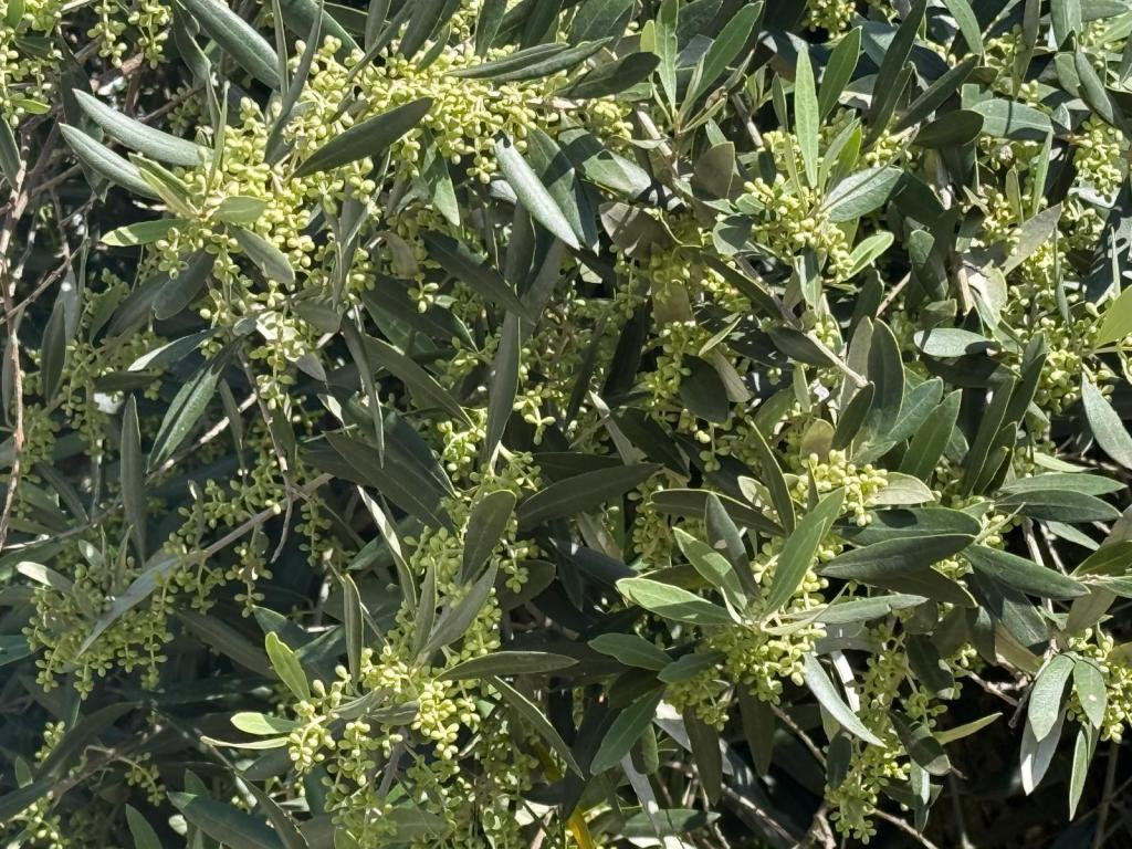 Ook de olijfbomen doen het goed en alle bomen zitten vol in de bloei en de jonge trossen zijn zich aan het vormen! Zelfs de boom die we ontdaan hebben van de dode takken 3 maanden geleden: men zegt dat als je de olijfboom snoeit deze ca. 2 jaar geen olijven geeft: hier niet dus!