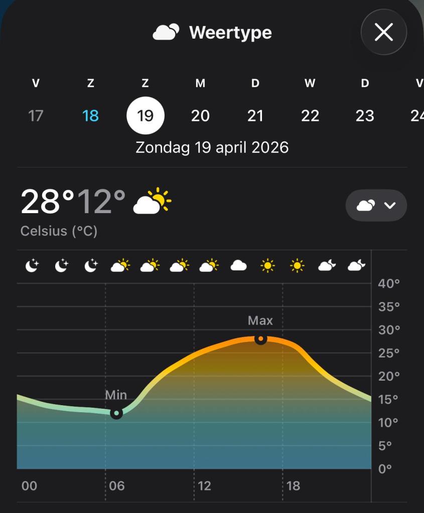 Vandaag, zaterdag 18 april, staat ons een zonnige en warme dag te wachten met temperaturen van 29 graden! Het begint ’s ochtends half bewolkt met 14 graden en die temperatuur gaat gestaag oplopen. Dat wordt de eerste dag al gelijk behoorlijk smeren!