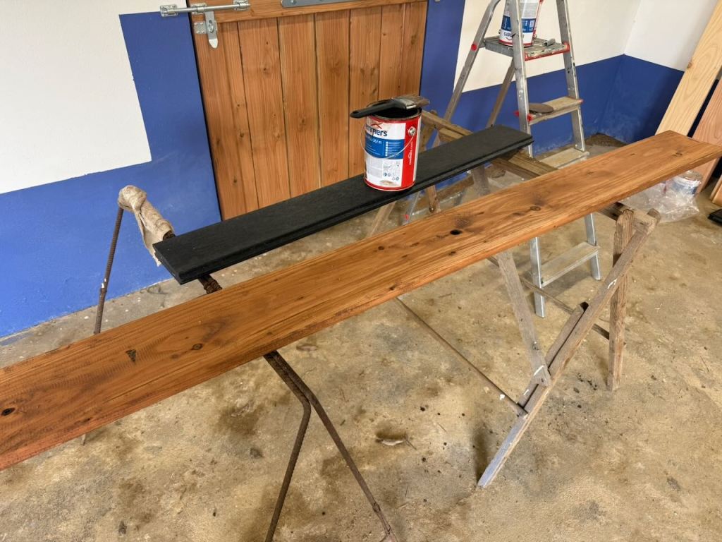 Geschaafd betekent dat de plank dan echt helemaal glad is en bij fijnbezaagd heeft het het nog een grove structuur. Waarom zo veel informatie? Nou, omdat het voor het verfwerk nogal wat uitmaakt! De gladde zijde is heel makkelijk met de kwast in de beits te zetten, maar de fijnbezaagde kant heeft meer werk; om de beits goed dekkend te laten zijn moet je er met de kwast een paar keer goed overheen met voldoende beits op de kwast. Dit begint op werken te lijken!