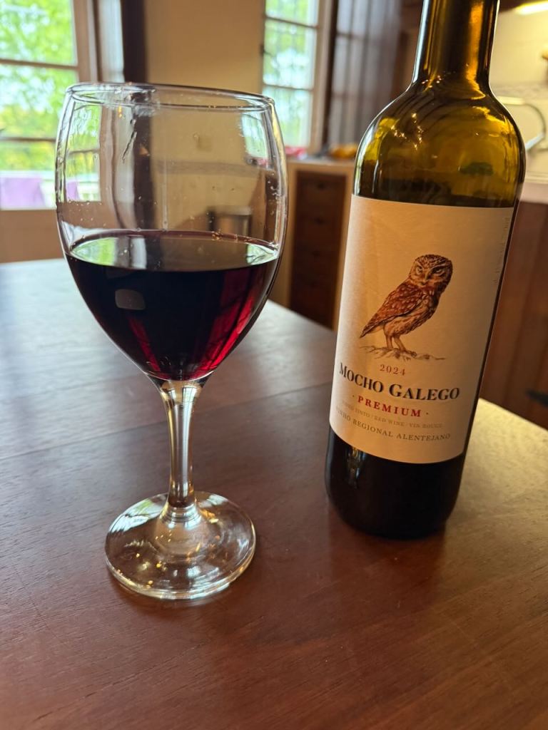 We sluiten de dag af onder het genot van een regionaal Alentejo wijntje: een lekker Mocho Galego Premium rode wijn. Online in wijnhuizen wordt deze te koop aangeboden voor € 14,45 per fles, maar hier in de supermarkt koop je een dergelijke slobberwijn voor € 2,99! Bom Homem!