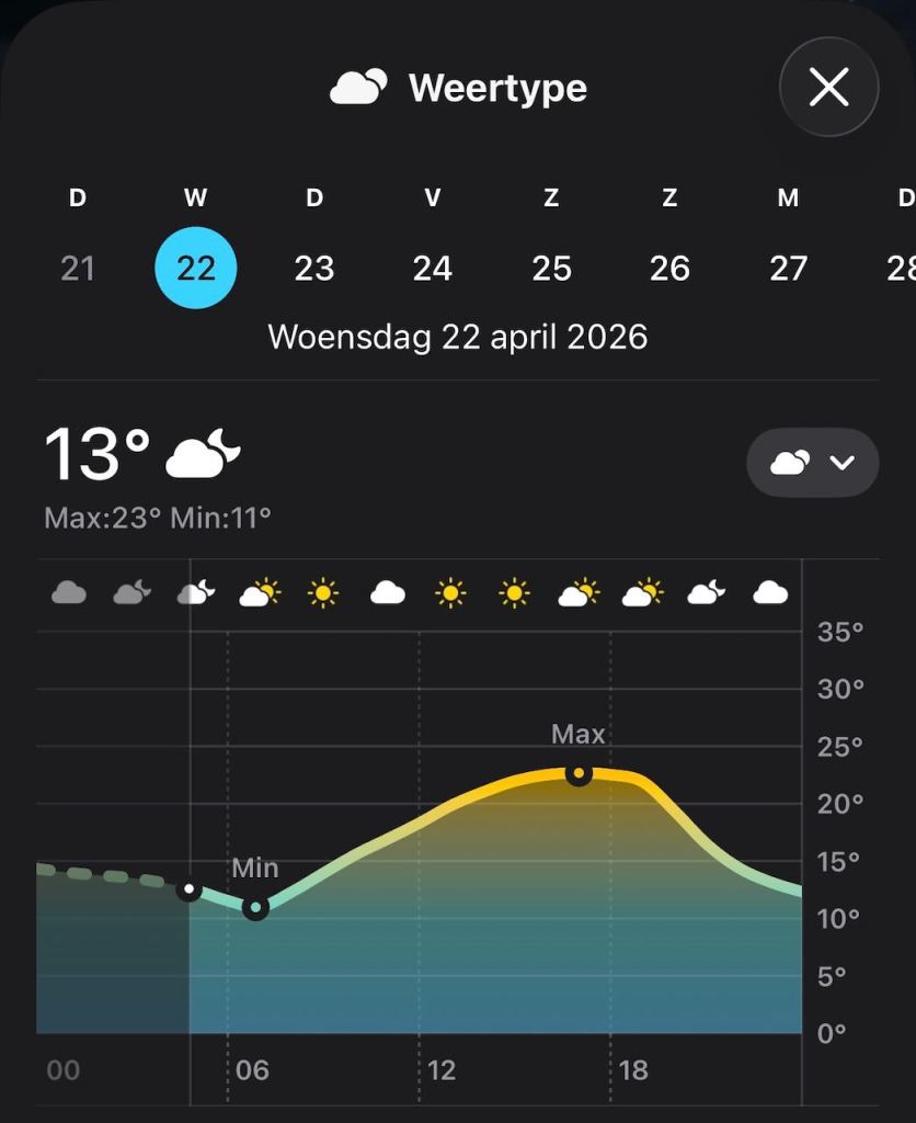 De rest van de weekvoorspelling laat over het algemeen zonnig weer met temperaturen van rond de 25 graden zien. Eind volgende week, richting ons vertrek, gaat de temperatuur wat naar beneden naar rond de 20 graden met kans op een buitje.
