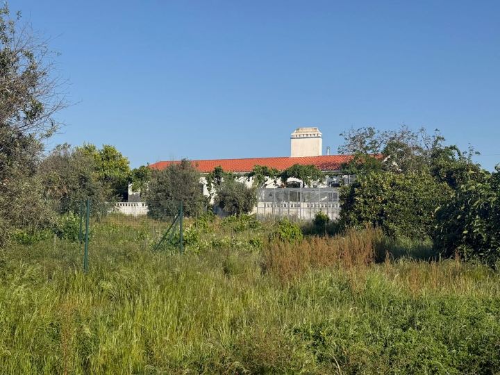 Wederom een foto van onze woning maar dan vanuit de achterkant van de stallen genomen. Hier zie je het schoongemaakte dak wat beter en op de voorgrond zijn ook de volières te zien. Als we er gaan wonen zullen we de begroeiing bij gaan houden: het woekert nu lekker door maar over een paar maanden is alles weer dor vanwege de warmte. Alleen rondom de bomen die beregend worden door de pompinstallatie zal dan nog groen te vinden zijn.