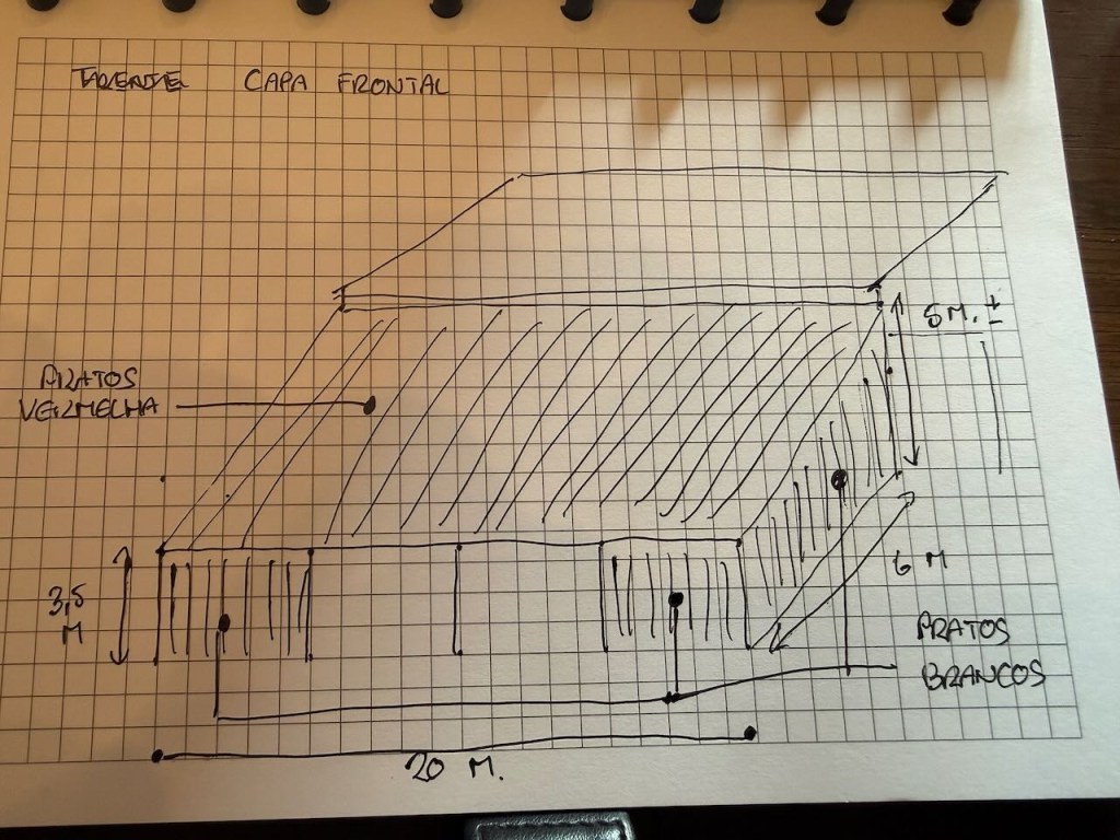 Voor de overkapping achter de loods hebben we ter plekke gekeken naar wat er wel en niet kan. Het is in ieder geval een hele oppervlakte: de loods is precies 20 meter lang en de muur is circa. 5 meter hoog. De aannemer heeft gevraagd een tekening te maken hoe we het zouden willen hebben.