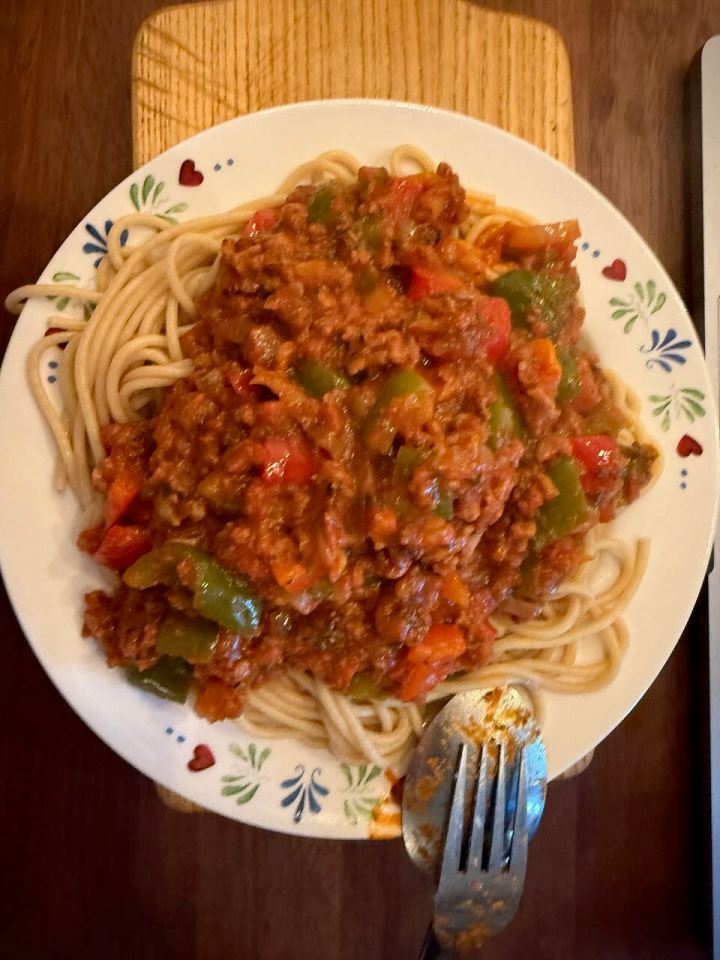 De innerlijke mens wil natuurlijk ook in haar behoefte voorzien worden. Dus we hebben de pannen maar weer gevuld met spaghetti en pastasaus en het vuur aangezet.